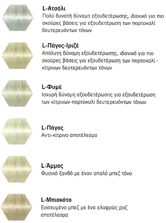 - Συνιστώμενη βάση εφαρμογής: ξανθό σκούρο 6-0 και πιο ανοιχτό με 30-70% λευκά μαλλιά.